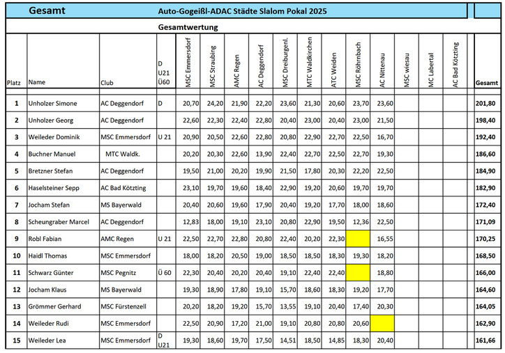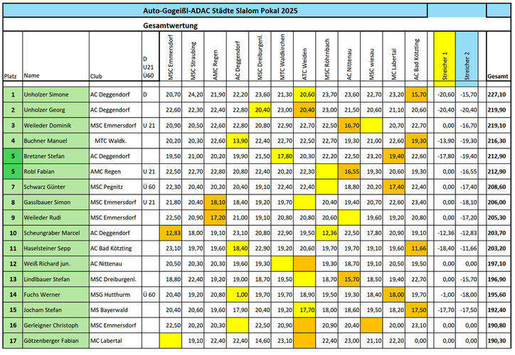 Aktuell liegt Fabian Robl als U21 Fahrer mit 45,20 Punkten auf dem ersten Platz, gefolgt von Familie Unholzer - zerscht da Schosch und dann die Simone. Mal schaun wie das nächste Woche nach dem Slalom des AMC Regen ausschaut.